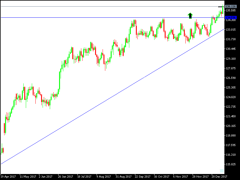 Rising risk-on sentiment helped the EUR/USD to resume strong gains, as the pair moved towards the highest levels in 28 months, reaching towards the resistance at the 136.36 level, the highest level since October 2015. Optimism for the EUR due to the close tightening of the ECB policy supported the Euro’s stronger gains against other majors. The economic sectors results in the Eurozone will support voices calling for abandoning the quantitative easing policy. The pair is awaiting an important announcement today in the shape of Eurozone inflation numbers, and achieving gains for the inflation will support more gains for the Euro against other majors.