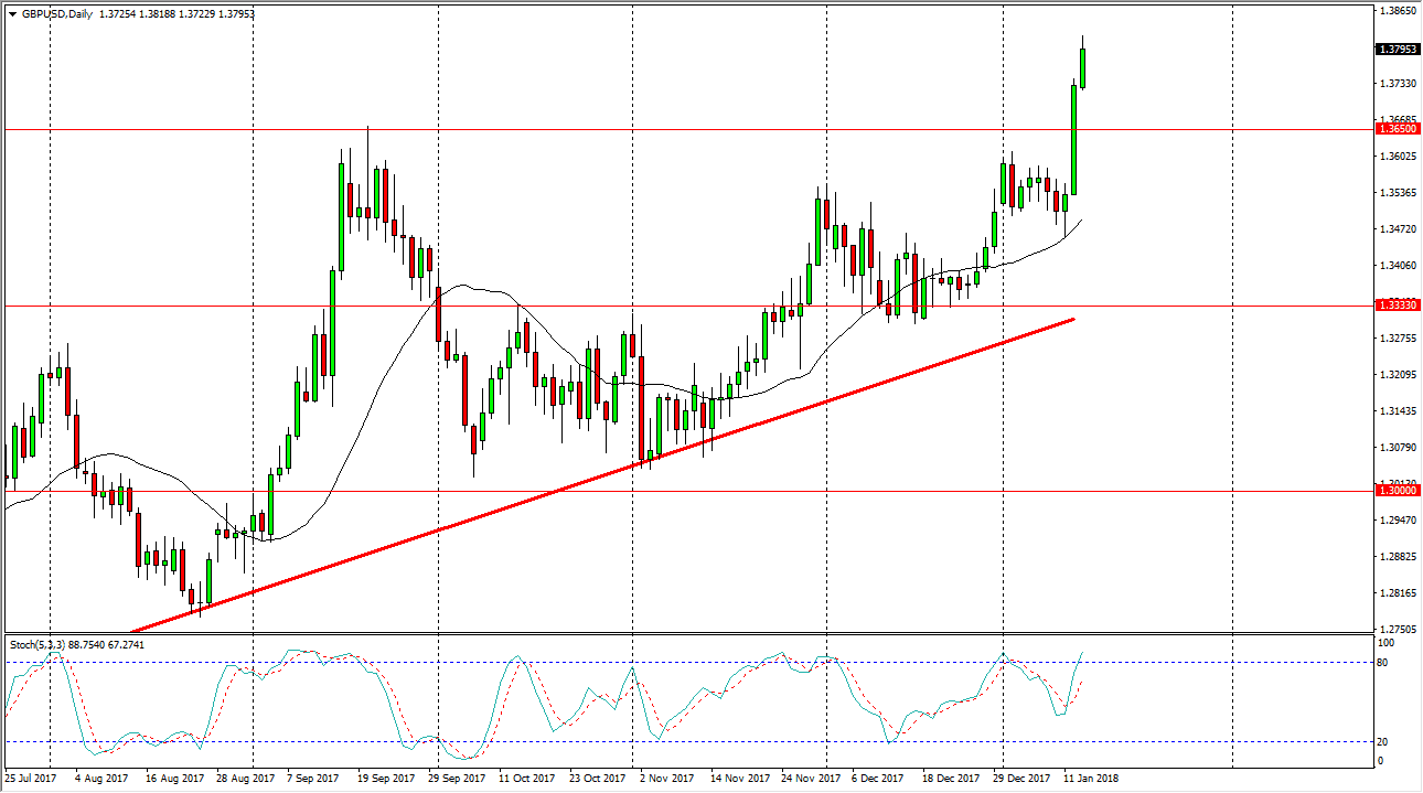 The British pound has broken higher again during the trading session on Monday, clearing and overcoming the highs from the Friday session. The market should then be able to break above the 1.38 level, given enough time. I think short-term pullbacks will be buying opportunities as it gives us an opportunity to pick up value. The 1.3650 level underneath is set to be support as it was massive resistance, and I think that now that we have cleared the gap on the longer-term charts, the market is free to go much higher, and I believe that we are getting ready to see a longer-term move to the upside in the British pound. This will be especially true if the agreement between the European Union and the United Kingdom turns out to be reasonable as the British leave the European Union.