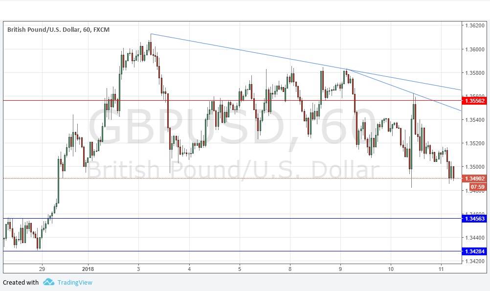 I wrote yesterday that the price was looking “heavy” and getting more likely to break below 1.3500 which could trigger a fall to the next support level. Although the price has broken below that level, the stronger fall has not really materialized, but there are initial signs now (as at the time of writing) that the movement is really beginning to happen. Technically the picture has become more bearish: descending trend lines can be drawn above, confluent with a new resistance level at 1.3556. There is still a long-term bullish trend in force, but it looks as if the price will reach 1.3456 at least today.