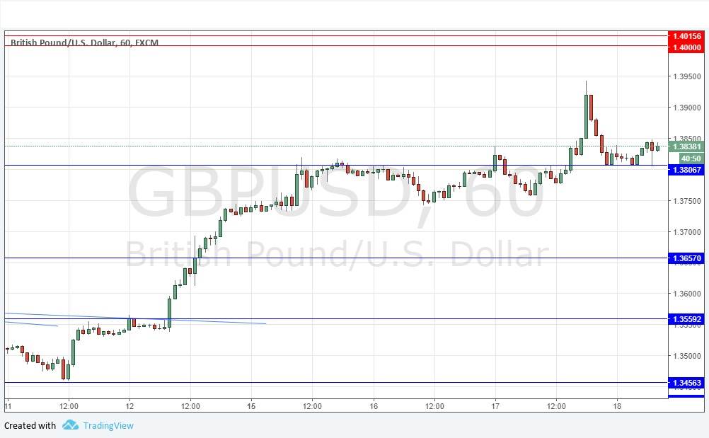 I was correct yesterday in taking a bullish bias, and in implying the situation would remain more bullish if the price stayed above 1.3725. The price rose over the day, eventually spiking up as high as 1.3950, a new 18-month high price, before falling back quite strongly. There are two interesting developments: the action over the day was more bullish than it was in EUR/USD, which tells us that the Pound may now be coming back into focus, and support is more obviously holding up here compared to EUR/USD. Coupled with the long-term bullish trend, this suggests it will be correct to maintain a bullish bias here. The problem is that the support level shown in the chart below at 1.3807 looks weak, and the other nearest key support and resistance levels are beyond what we might expect the price to reach today. However, I think the price is more likely to rise over the course of today than fall. If it reached 1.40 over the coming days, that will be a very big psychological milestone for the Pound.