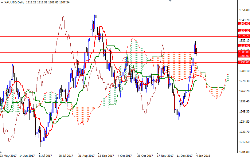 XAU/USD returned to the Ichimoku clouds on the H1 chart as expected after the market failed to stay above the 1316 level. The shorter-term charts are slightly bearish, but there is a strategic support at 1305, the confluence of a horizontal support and the bottom of the hourly cloud. If this support remains intact, we may revisit 1309 and 1313/2. The bulls have to lift prices above 1313/2 to challenge the resistance in 1317/6.