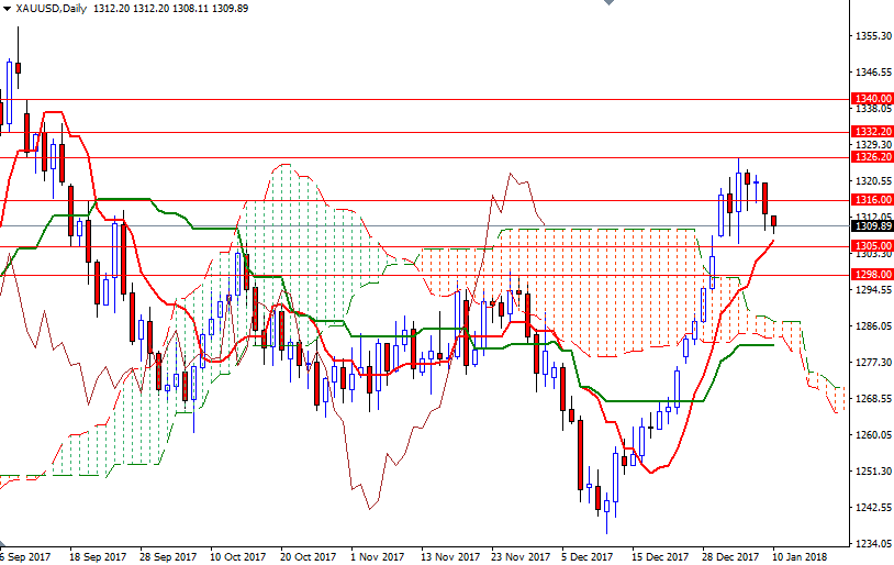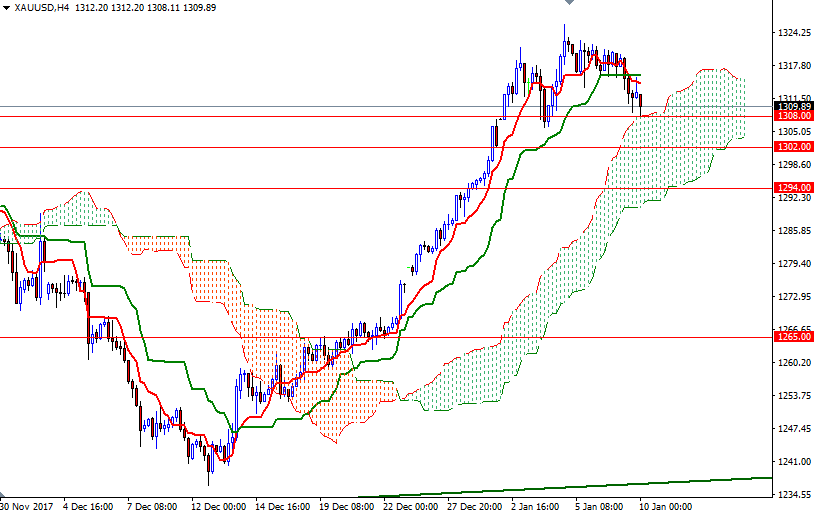 Gold prices fell $7.50 an ounce on Tuesday as the dollar’s rebound continued to weigh on the market. XAU/USD retreated to the 4-hourly Ichimoku cloud as anticipated after prices broke blow the support in the $1316-$1315.80 area. Gold is currently trading at $1309.89, lower than the opening price of $1312.21.