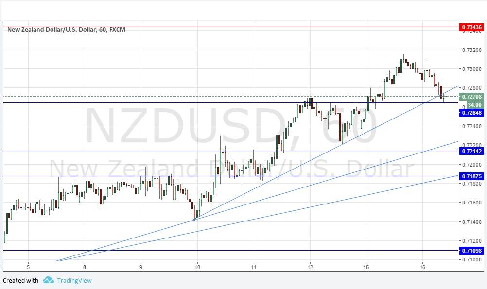 Yesterday I had a bullish bias and saw possible long trade set-ups from retracements to the new support levels as likely to be good trade opportunities over the short-term. Although we have seen a resurgence in the U.S. Dollar over recent hours, which has swung the price down here in this currency pair, the support levels are all intact: the highest one at 0.7265 is just being reached at the time of writing. I still think a long trade here, if we do get a bounce at the New York open or soon afterwards, would still be an attractive trade, so I am not changing my bullish bias yet. There is no long-term trend.