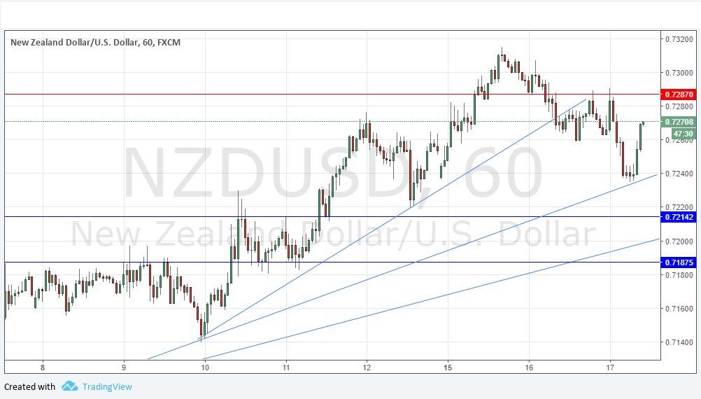 Yesterday I had a bullish bias, but it did not work out, as the U.S. Dollar made a surprisingly strong showing, even against a generally strong NZD. The price action printed fresh, lower resistance at 0.7287, before close to the second supportive trend line at which the price then turned around strongly as London opened, moving up with some momentum. I still have a bullish bias in line with the medium-term trend, but the bullish case looks weaker. I would not be surprised to see the price consolidate for a while now, with the resistance at 0.7287 capping the price.