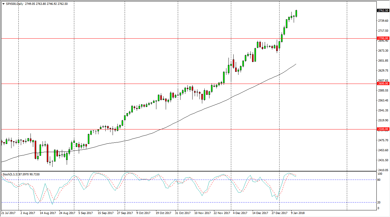 The S&P 500 continues to rally, as the Thursday session was bullish yet again. We broke above the top of the hammer from the Wednesday session, and more importantly in my estimation: the top of the shooting star from Tuesday. We have made a fresh, new high, and it looks as if the market continues to defy gravity overall. Money managers continue to come back out of hibernation after the holidays, and that has fresh, new money going to work on Wall Street. I think short-term pullbacks are buying opportunities, and the alpha rhythmic traders are certainly waiting to pick up any losses that do occur. Longer-term, I believe that we go looking towards the 2800 level above, as the S&P 500 continues to find reasons to go higher. I believe that the 2700 level underneath is the hard “floor” in the market currently as the uptrend is so strong. Beware though, the stochastic oscillator is crossing in the oversold area.