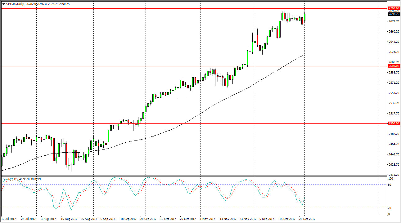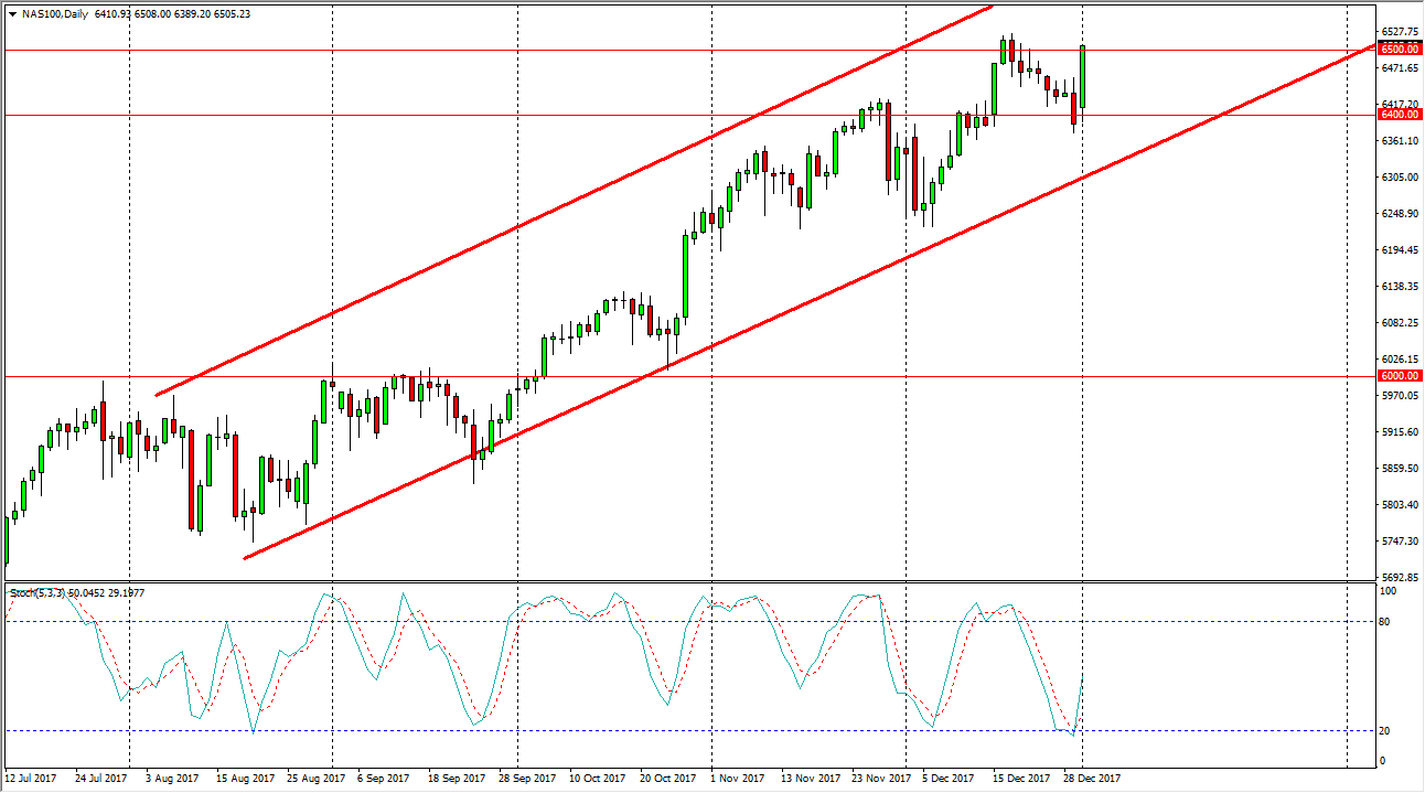 The S&P 500 had a positive start to the year, as we reached towards the 2690 handle. There is an obvious resistance at the 2700 level, and if we can break above there think that the market is free to go much higher. Eventually, I do expect this to happen, but eventually we should go to the 2750 handle. I think that pullbacks of this point should be buying opportunities, especially near the 2650 handle, which is a minor support level, followed by an even more significant support level at the 2600 level. I believe that the buyers will continue to look at pullbacks as opportunities to take advantage of value in a market that is obviously very bullish. With the tax plan passed in the United States, it’s very likely that we will continue to see US stock markets rally.