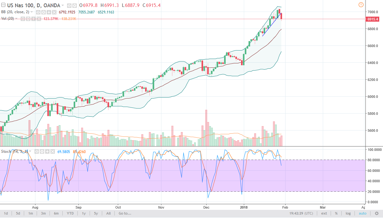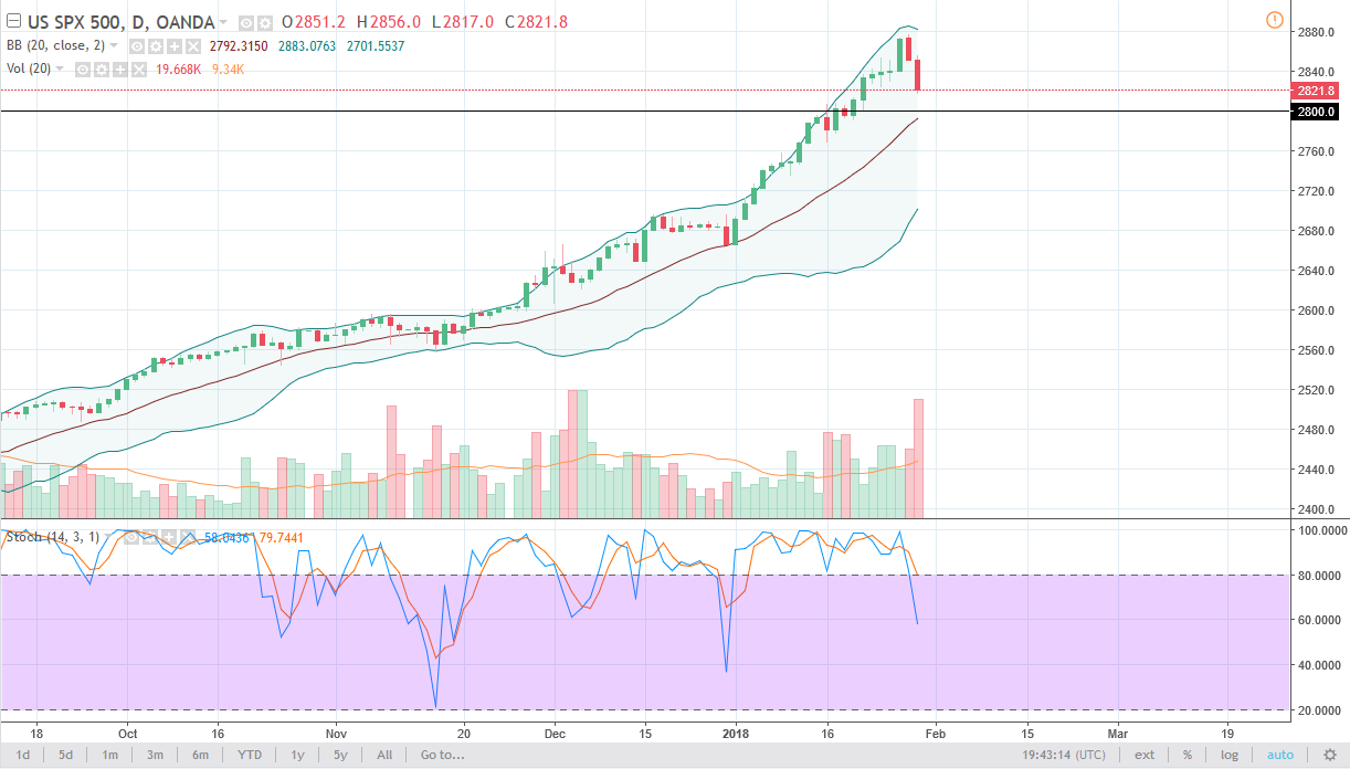 The S&P 500 has broken down during the trading session on Tuesday and formed a very negative candle on strong volume. However, a little bit of realism is necessary when looking at this chart, because we have simply seen a 1% decline. Quite frankly, at this point I would love to see a pull back to even lower levels, and the 20 SMA is just below the 2800 level, so that would be a nice target. The stock markets are overbought by any measure you can use, so I think this is going to be a nice buying opportunity at the end of the move. Longer-term, I suspect that we are going to go looking towards the 3000 level. I have no interest in shorting this market, as we are in a very strong uptrend, and the fundamental still favor higher stock market pricing.