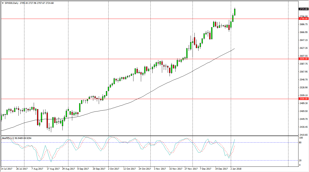 The S&P 500 rallied significantly during the trading session on Thursday, as we continue to see more volume jump into the US stock markets. As we approach the jobs number today, it could be very volatile, but I would love to see some type of pull back towards the 2700 level, where I would expect to see a lot of buying pressure. A bounce in this area should continue to send this market to the upside, but you will probably have to be quick, because this reaction will be almost immediate after the jobs number at 8:30 AM in New York City, which is before the underlying index trades. I think longer-term, we are going to go to the 2750 handle, and then the 2800 handle after that. It’s not until we break down below the 2680 handle that I would be concerned.
