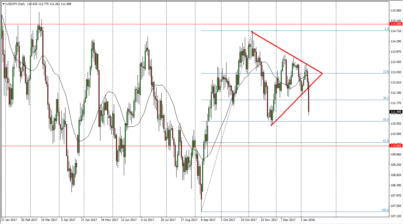 The US dollar fell significantly against the Japanese yen during the trading session on Wednesday, slicing through an uptrend line, breaking down below the bottom of that line and suggesting that we are going to continue to see bearish pressure. Quite frankly, this is a very negative candle, and this suggests that we are going to continue to see a bit of negative pressure. I believe that the 111-level underneath is supportive, and a breakdown below there I would anticipate that the market would go to the 110 level which is the 61.8% Fibonacci retracement level. Market participants continue to be very back and forth in this market, as this pair tends to be volatile. The very suggestion that the Bank of Japan may be looking to step away from quantitative easing has had a very detrimental effect. However, I think it’s only a matter of time for the buyers return, so I’m looking for an opportunity to go long, but don’t see it yet.