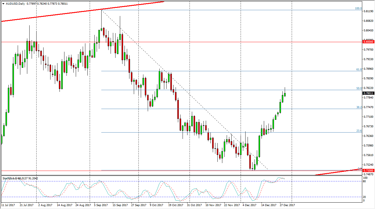 The Australian dollar rallied during the trading session on Friday but gave back about half of the gains. We ended up forming a shooting star, and it is also at the 50% Fibonacci retracement from the most recent move lower. However, we are in a longer-term uptrend channel, so I think it’s only a matter of time before the buyers get back involved. Gold markets rallying will help of course, and we did break above the $1300 level during the day, which of course is very bullish. The US dollar seems to be struggling overall, and that will help send this market higher also. Once we break above the top of the shooting star from the Friday session, I believe we will then go looking towards the 0.79 handle above. If we do pull back, look for short-term bounces or supportive candles to get involved as I think the 0.77 level underneath will be very supportive.