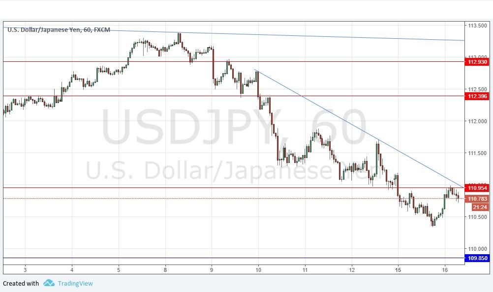 I wrote yesterday that the support below at 109.85 is almost confluent with a very big round number (110.00) and so could be an interesting medium to long-term long trade opportunity if reached. Over the short-term, bears could focus on the next touch of the bearish trend line visible in the price chart below. This is still valid as a technical focus, but is now even more sharply so, as the new key resistance level at 110.95 is precisely confluent with the trend line, and has held clearly and cleanly over the past few hours. This is very likely to be a pivotal point today, with a break above being a bullish sign likely to indicate a reversion to the long-term ranging conditions which have dominated this pair’s price movement. Alternatively, if it holds until New York opens and then turns clearly bearish rejecting the level, it is likely we will see a continuation of the downwards movement. Looking to the longer term, this entire price area is interesting, as it is close to 110.00 which is psychologically important and might provide a long-term low, so a medium or long-term long trade opportunity might arise. I have no directional bias, there might be either a long or short opportunity today, or even both.USDJPY