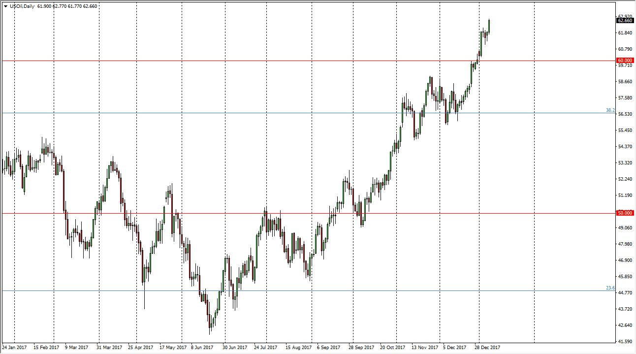 The WTI Crude Oil market rallied significantly during the trading session on Tuesday, breaking above the top of a couple of the hammers. The market clearing the $62.70 level is a good sign, and I think at this point will probably go looking towards the $63 level rather quickly. I think pullbacks are buying opportunities and the $60 level should be thought of as a “floor” in a market that is obviously very bullish. With tension in the Middle East, Russians and OPEC nations willing to cut back on production, and the US dollar following a downward trajectory, it makes sense of this market may continue to go to the upside. I don’t know if we can break above the $65 handle and the short-term, but it certainly looks as if traders are going to try to find out.