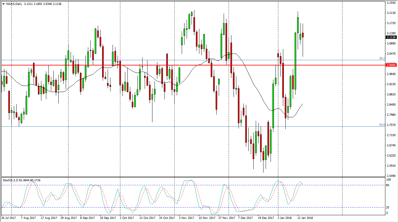 The natural gas markets have been extraordinarily noisy during the trading session on Tuesday, as the volume picked up after the Martin Luther King Jr. holiday. Because of the volatility that we have seen, I think that the market will continue to be very difficult to hang onto, but I think ultimately you need to look at the history of this market, which has been every time we show signs of strength, there is nothing but disappointment for the buyers. A breakdown below the $3.00 level should send this market down to the $2.75 level next. I think there is more than enough resistance at the $3.20 level to keep this market down, and I think that any signs of exhaustion should be an opportunity to go short yet again. This is the most bullish season of the year, and yet we don’t hang on the gains.
