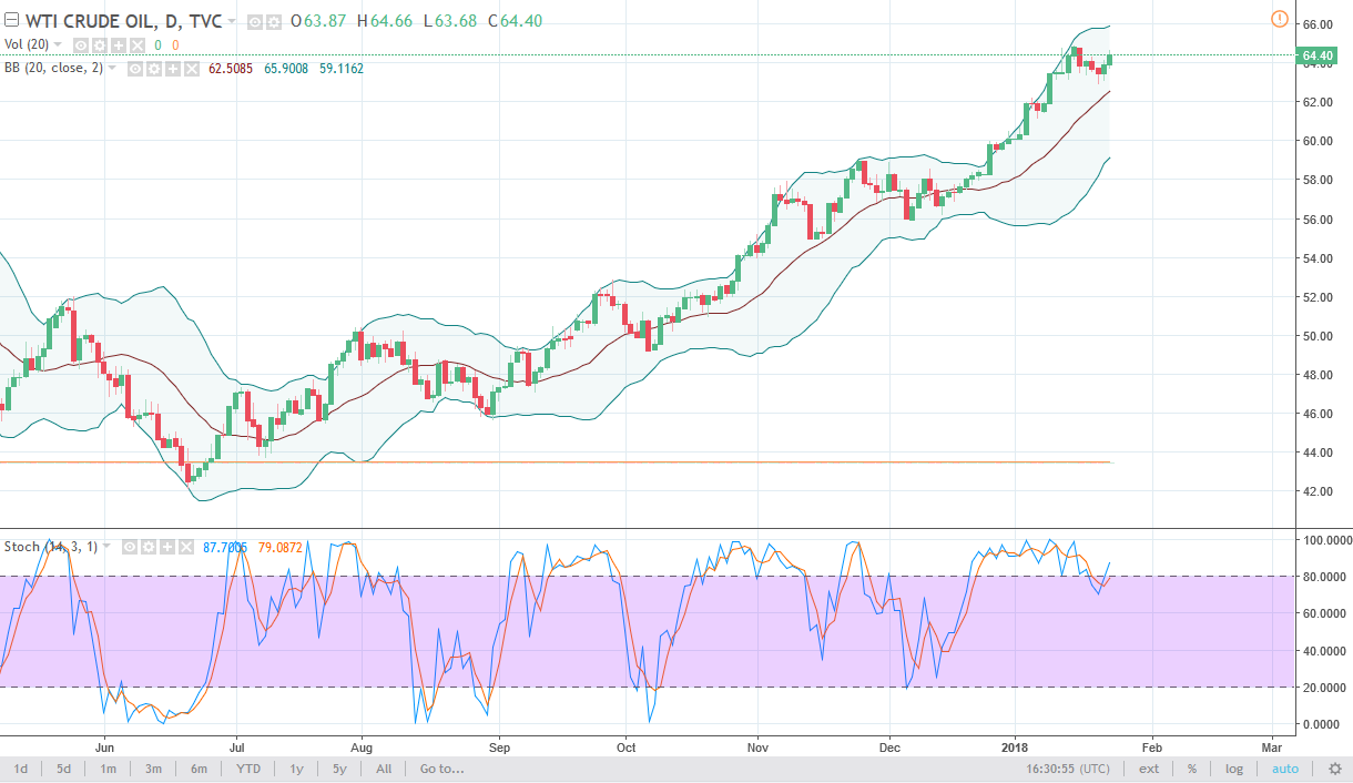 The WTI Crude Oil market has been slightly positive during the trading session on Tuesday, as we continue to grind towards the $65 handle. That’s an area that has a certain amount of psychological resistance, but I think we could break above there. Once we do, the market should go to the $67.50 level, as it is the next major barrier. Pullbacks of this point should continue to be a momentum building exercise, especially down near the $62.50 level. I think that the overall uptrend continues, especially if the US dollar continues to fall. If we break down below the $62 level, that sends the market down to the $60 level next, and then eventually lower than that. Expect volatility regardless, but it looks as if the buyers are still going to be aggressive.