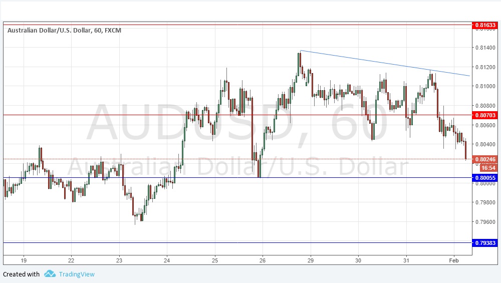 I wrote yesterday that although the technical picture was still bullish, and I had a slight bullish bias, I did not see this as an especially great pair to be long of, with the Australian Dollar looking less bullish than the European currencies. My fears for the bulls were justified, as the price has now moved down quite strongly from a new bearish trend line shown in the chart below, printing a new resistance level at 0.8070, although this level does look doubtful, so I would be very careful about using it. The next important test looks likely to come if the price reaches the nearest support at 0.8005, as this is confluent with a psychologically important big round number at 0.8000. I have no directional bias on this pair today.