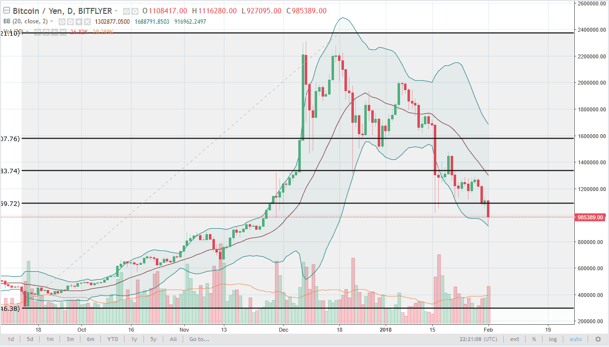 Bitcoin traders sold off against the Japanese yen as well, as the market finally got below the ¥1 million level. By breaking below there, it frees up more selling pressure, perhaps reaching down to the 800,000 and level. I think rallies at this point will be selling opportunities, and I don’t see much in the way of an opportunity to start buying. I think that there has been far too much in the way of damage to the Bitcoin markets for retail traders to feel comfortable. I believe that these days where we lose 11% will continue to be a major issue, so I think that if you have the ability to trade these markets on a leveraged account, you might be able to make money on the downside. Until we get a strong and strong volume day, it’s very difficult to buy this market as we continue to see selling pressure pick up occasionally, and volume seems to be favoring the sellers overall.