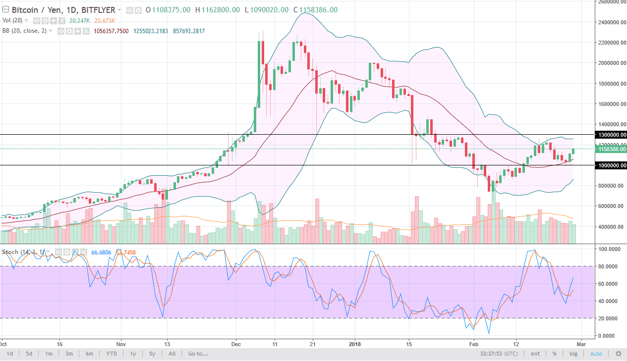 Bitcoin also rallied against the Japanese yen, which is crucial. Japan is 40% of Bitcoin volume, so this market must rally for the rest of the crypto currency markets to continue to go higher. We are currently trading between the ¥1 million level on the bottom, and the ¥1.3 million level on the top. If we can break above there, then I think we go to the ¥1.5 million level, and that the ¥1.6 million level. I believe the pullbacks offer value, but if we were to break down below the ¥1 million level, I think that could bring out a lot of short selling, perhaps reaching down towards the ¥800,000 level. I believe that larger traders are trying to build up a position, but it should also be noted that a bit of a downtrend line is just above at the 1.3 level as well. In other words, expect a lot of noise.