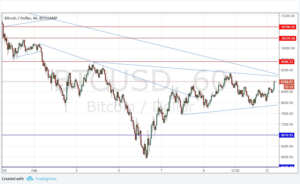 I wrote last Thursday that if the price could get established above the medium-term bearish trend line at about $8,500, it would be a significantly bullish sign. It took another day or so for this to happen, but it has happened. The resilient recovery in Bitcoin after it looked down and out has been a technical surprise. The price is now a long way from support or resistance levels, but it is looking relatively bullish, and seems to be basing within a triangle. A bounce off the lower trend line of this triangle looks like the highest-probability trade which might set up today. I have a bullish bias against the long-term trend, simply because the strong rise of the past few days has an impulsive character, suggesting that it has further to run.