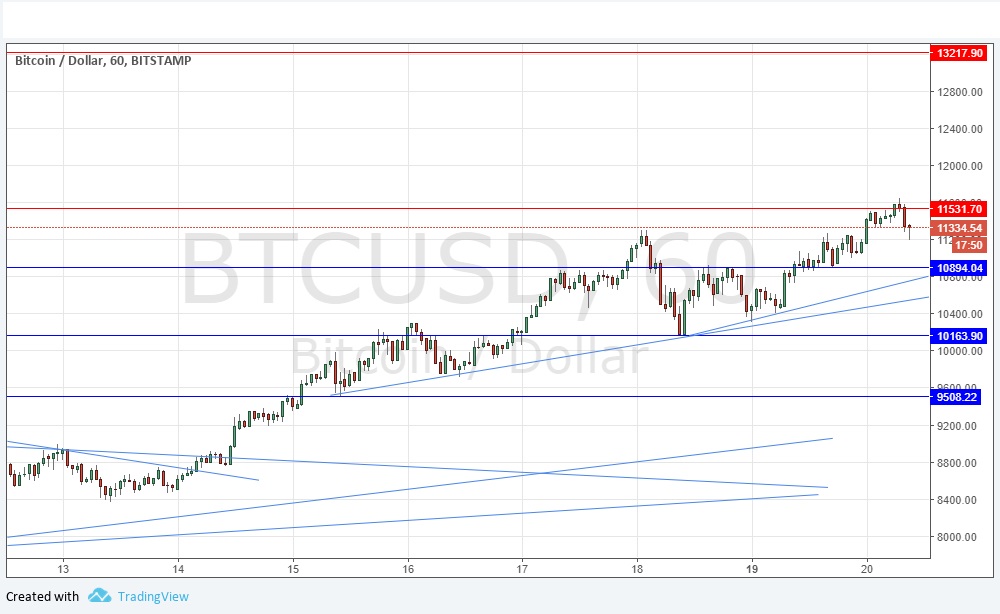 Yesterday I had a bullish bias, and happily the price has continued to rise. The picture now looks still a little more firmly bullish, with a clear trending structure of higher lows and highs supported by trend lines, as well as a new support level at $10,894. The most interesting technical development is the lack of the any resistance beyond $11,532 until $13,218, suggesting the price could start to move up a lot more quickly if $11,352 is broken. There is no reason not to have a bullish bias.