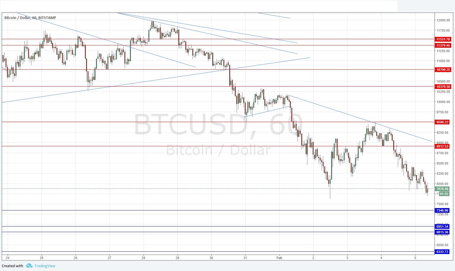 Technically, the picture is dominated by bearish trend lines. There are minor signs that the price may be bottoming out just below $8,000 but I don’t feel optimistic about that outcome. It looks as if the price will continue to move down a little further at least. I would be extremely cautious about taking any long trades just yet. I maintain a bearish bias and prefer a potential short trade from $8,913.