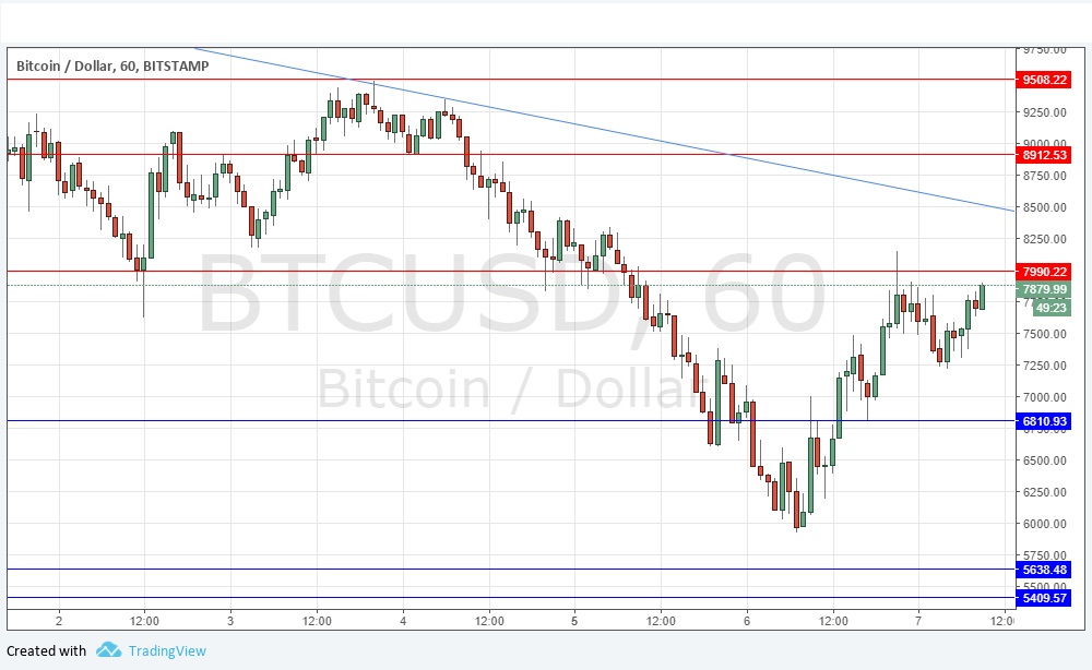 Despite the bullish impulsive movement, there is a medium-term bearish trend line at about $8,500 which is likely to be a severe test for Bitcoin bulls. If the price can break above this level it would be a bullish sign. The momentum seems to be with the bulls right now, but I have no directional bias.