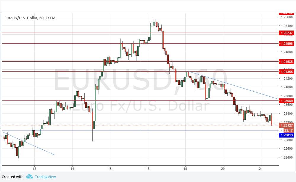 I wrote yesterday that we are now seeing the price fall and it looks decisively counter-trend, as if it is going to fall all the way to 1.2300, so I had a short-term bearish bias. My bias was correct, the price has continued to fall and is still looking likely to reach 1.2300. I have also identified a new, lower level of probable resistance at 1.2369 which is a confluence of a recent inflection point and a short-term trend line. There is a good chance of short-term price reversals at either 1.2301 or 1.2369, prior to the FOMC release due later today which could provide some unpredictable, volatile directional price movement.EURUSD