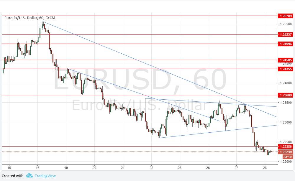 As Europe opened yesterday, this pair was looking as if it were going to move up, consolidating bullishly just below a short-term trend line which marked the upper limit of a consolidating triangle. This triangle can still be seen in the price chart below. The bullish breakout failed, and the price moved down heavily from this failure, falling a long way. Recent hours have seen the pair sell from the psychological level at 1.2250 and from a new resistance level at 1.2238. Despite the long-term bullish trend, these are very bearish signs, and the absence of any key support until the 1.2000 area suggest that the price could still fall much further soon, so I have a short-term bearish bias.EURUSD