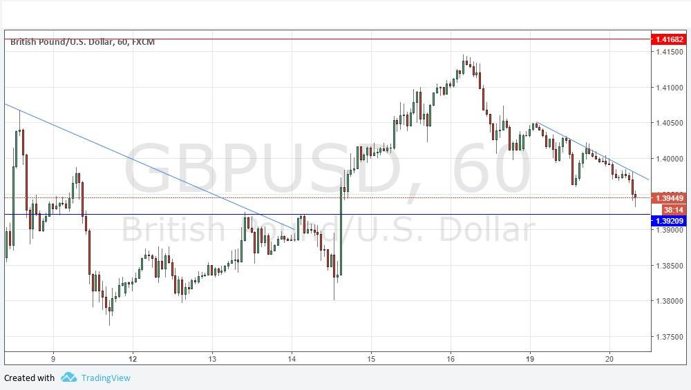 I wrote yesterday that a break below 1.3981 was also likely to produce a fall to at least 1.3921, and it looks as if this is what is playing out now as the price moves down, mostly due to U.S. Dollar strength. I had seen a little relative strength in the British Pound, which appeared to be holding up better than the Euro with which it is usually closely positively correlated. This seems to have disappeared now, so I have a bearish bias today and see the price as likely to reach 1.3921