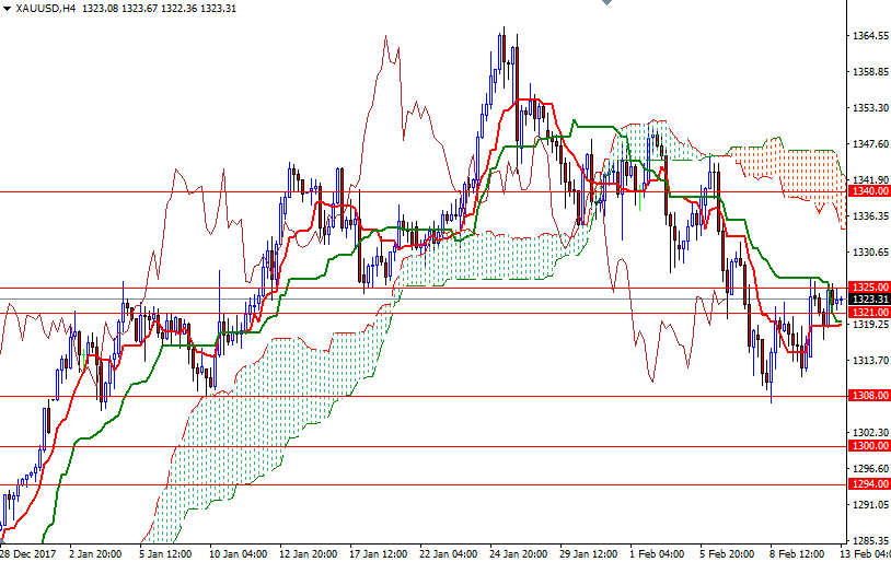 The market is trading below the Ichimoku clouds on the H1 and the M30 charts. In addition to that, the Tenkan-sen (nine-period moving average, red line) and the Kijun-sen (twenty six-period moving average, green line) are positively aligned on both charts. It looks like XAU/USD will try to climb above the 1326/5 area one more time. If the bulls confidently takes out yesterday’s high, then the market will be heading towards the 4-hourly Ichimoku cloud. The bulls have to produce a daily close above the 1334.30-1332 area to gain momentum for 1342/0.