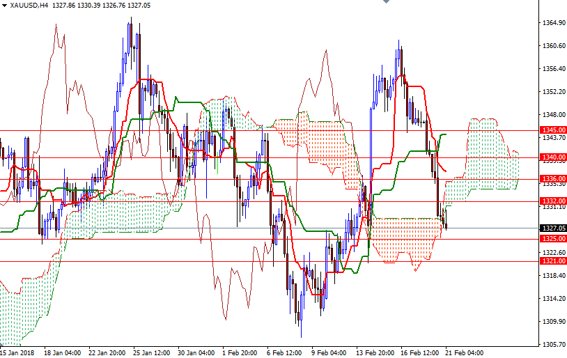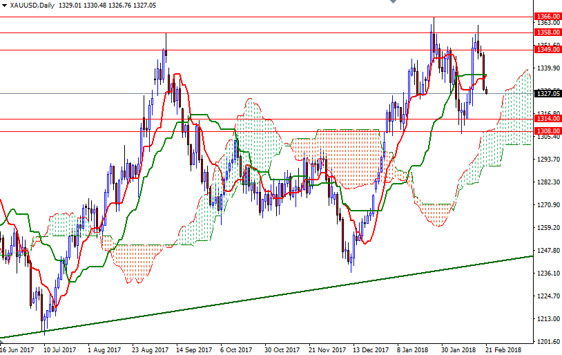 Gold prices continued to slide yesterday, extending losses from Monday’s session, as the dollar continued to appreciate. Technical selling pressure was also behind gold’s decline on Tuesday. Dropping through the support at $1340 attracted chart-based sellers and dragged prices to the Ichimoku cloud on the 4-hour chart as anticipated. XAU/USD is currently trading at $1327.05 an ounce, lower than the opening price of $1329.01. Market participants are awaiting minutes from the latest Federal Reserve Open Market Committee meeting, due to be released later today, for clues on policy makers’ opinion on the economy.