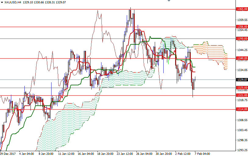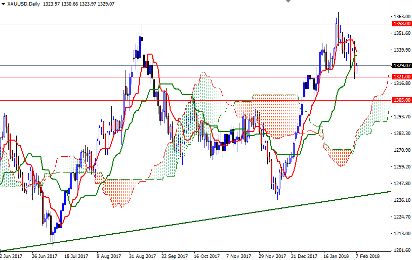 Gold prices fell $13.72 an ounce on Tuesday as strength in the U.S. dollar and a recovery in stock markets weighed on the market. XAU/USD initially reached the Ichimoku cloud on the 4-hourly chart as anticipated but it was unable to pass through. Consequently, prices broke below $1332 and retreated all the way back to the support at the $1321 level. World stock markets were mostly higher yesterday and the major U.S. stock indexes recouped some of Monday’s losses.