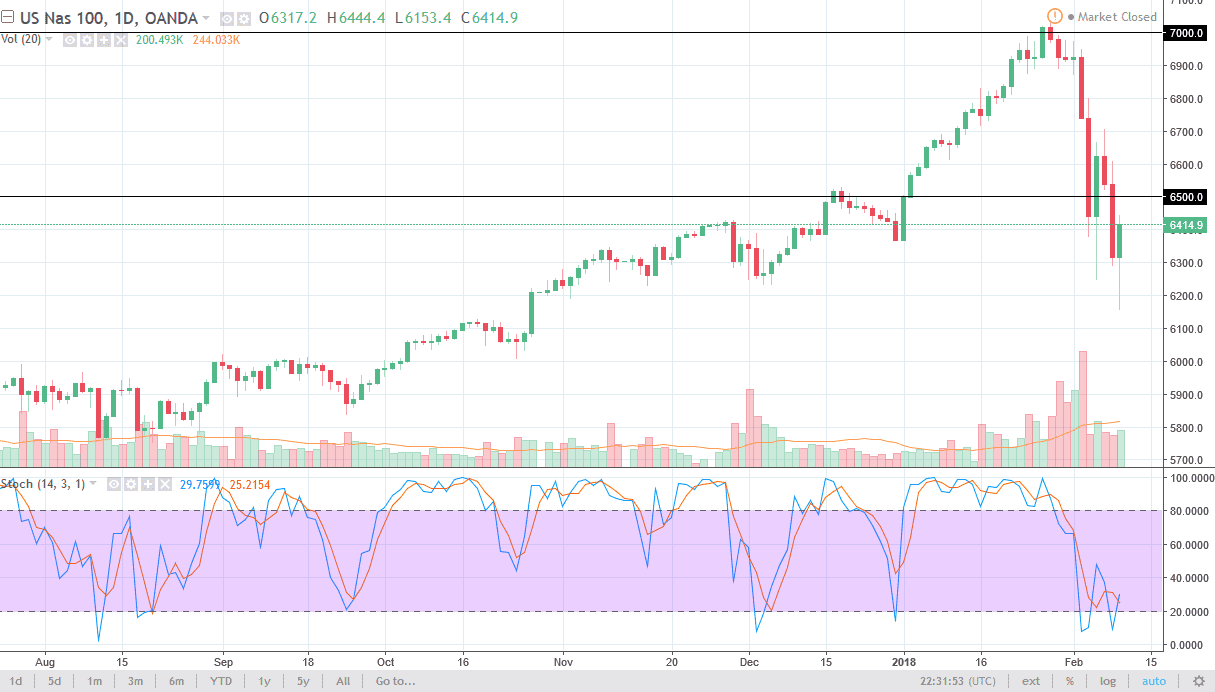 The S&P 500 initially fell during the trading session on Friday yet again, but we continue to find buyers underneath and we have now seen a rebound late during the Friday session. This is a very strong sign, because a large amount of orders came in late during the day, and that signifies institutional buying. The large amount of volume is indicative of the market trying to find a bottom, so I think if we can break above the top of the range for the day, the market should continue to go higher. There has been a lot of damage done, but we closed well, which is a good sign for the upcoming week. Ultimately, I think that the 2500 level is the “bottom of the trend”, and therefore if we break down below there are things get ugly and a very quick amount of time. I do believe in the uptrend, I think eventually we go looking towards the 3000 but we need more confidence building along the way.