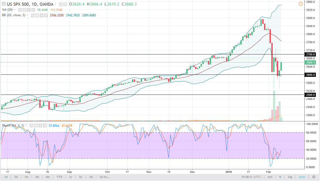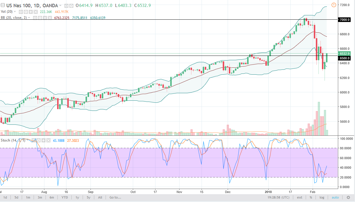 The S&P 500 rallied during the trading session on Monday as traders come back to work, after a massive selloff last week. I believe that a lot of so-called “smart money” is starting to get back into the marketplace, and I believe that we are going to test the 2700 level above. If we can break above there significantly, then the market goes looking towards the highs again. This has been a significant correction, but at this point it is only a correction. In fact, I believe that the uptrend is defined by the market staying above the 2500 level. If we break down below there, then we will more than likely go looking to enter a bear market. In the meantime, it looks as if the buyers are coming into the market again, and as volume picks up, that should be good as well.