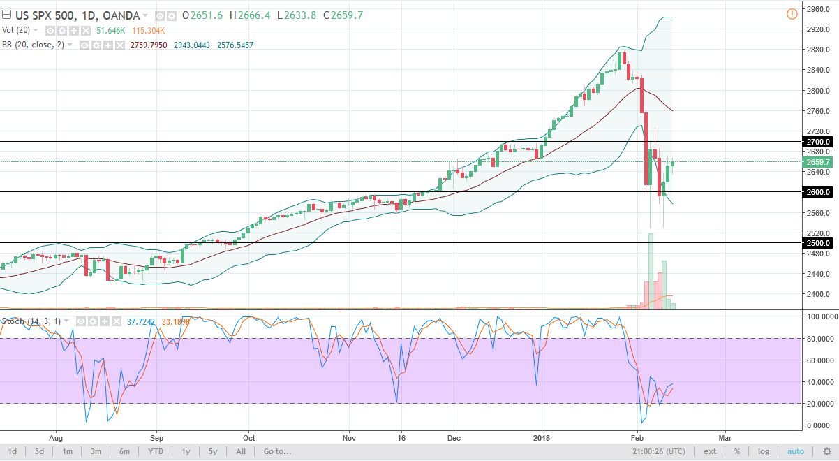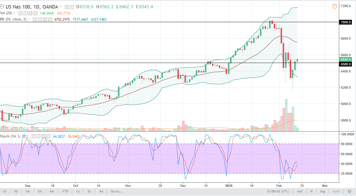 The S&P 500 initially fell during the trading session on Tuesday but turned around and rallied a bit to form a bit of a hammer. It looks as if we are going to try to reach towards the 2700 level above, an area that has recently been resistance. If we can break above that level, it’s likely that we will continue to go much higher, perhaps reaching towards the 2800 level. Above there, the market should then go towards the highs again. I believe that the 2600 level underneath is a bit of a “floor” that extends down to the 2500 level. This is a market that has seen a lot of volatility as of late, so I think we will continue to see more sideways action, as the market is trying to figure out what to do next, especially after such a dramatic fall.