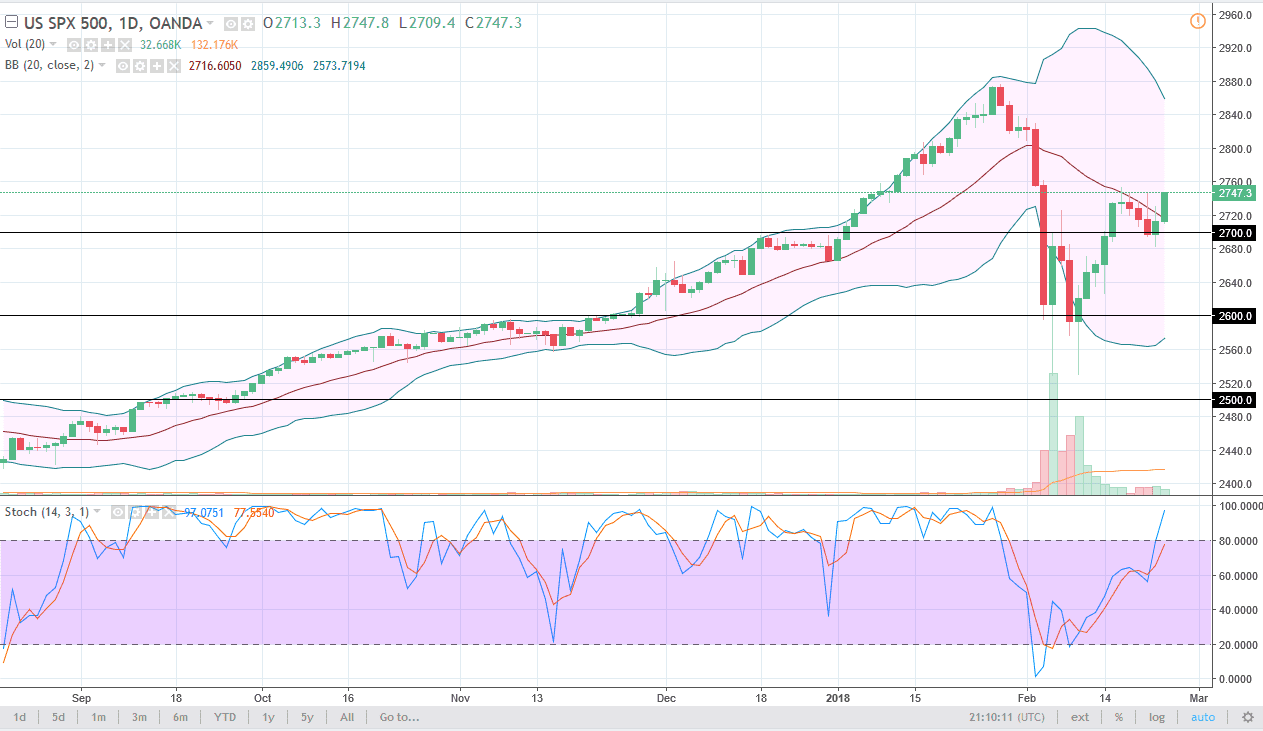 The S&P 500 has rallied significantly during the trading session on Friday, gaining over 1.25%. It looks as if we are pressing the top of the recent consolidation, and the weekly chart formed a hammer. I think we are going to continue to go higher, a break above the 2758 level then sends the market looking for the 2850 level over the longer term. I think that this week should be very bullish for the S&P 500 barring some type of negative headline coming out. I think that the 2600 level underneath is support, extending down to the 2500 level. Longer-term, I believe that we are going to continue to go towards the 3000 level, which is my longer-term target for the year, perhaps even by the end of the summer.