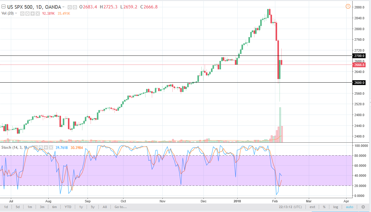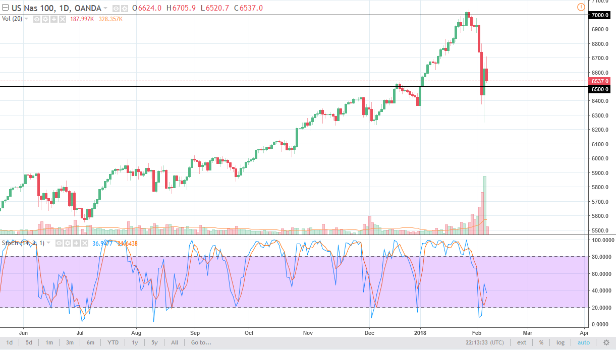 The S&P 500 looked rather strong during the day initially on Tuesday, breaking well above the 2700 level, but rolled over and ended up forming a horrible looking candle. Because of this, I suspect that we are going to drift lower again tomorrow, perhaps trying to reach down to the 2600 level. There is a lot of damage done to this market, and I am a bit concerned about the lack of volume during the day. The question now becomes whether we are breaking down again, or are we trying to form some type of base from which to grow? If you are not involved in the S&P 500, it’s not a bad idea to stay away and let a few more candles form on the daily chart.