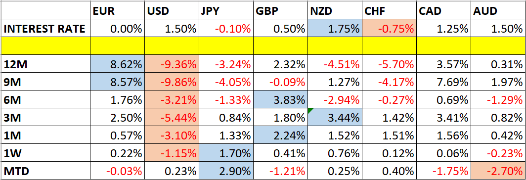 Let’s take a look at the relevant data of currency price changes and interest rates to date, which we compiled using a trade-weighted index of the major global currencies: