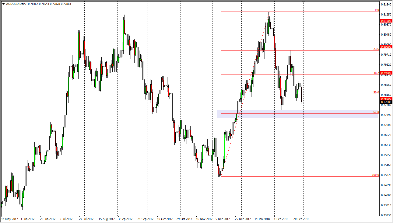 The Australian dollar has broken down significantly during the trading session on Tuesday, reaching towards the 0.7750 level. As you can see on the daily chart, I have a lavender rectangle at the 61.8% Fibonacci retracement level. If we break down below that level, I think we will wipe out the entire up move, reaching back towards the 0.75 level, and continuing the overall consolidation that we have seen for some time. I do believe that the US dollar eventually falls, but perhaps the rest of the world isn’t quite convinced. At this point, I’m waiting to see if the 61.8% Fibonacci retracement offer support, or if it gives way. I will buy a bounce, I will short this market we break down below there. Beyond that, there is in a whole lot to say about this market other than that. Obviously, pay attention to gold markets as they can have a major influence.