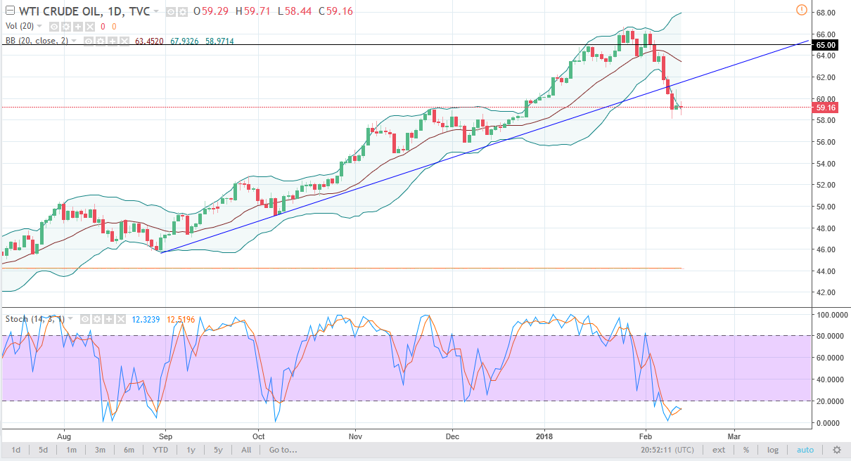 WTI Crude Oil market traders went back and forth during the day on Tuesday, as we have recently broken down below the uptrend line. Ultimately, the market looks as if it is going to continue to be very rocky, but as you can see on Monday we sold off as soon as we tried to rally above the uptrend line. I think if we can break down below the $58 level, the market will probably go down to the $56 level again. Otherwise, any rally at this point should be a selling opportunity until we can break above the $62 level. At that point, I would anticipate a move to the $65 level, but that is very unlikely as we have a major oversupply of crude oil due to Americans drilling. I believe that we have seen the highs for the year.