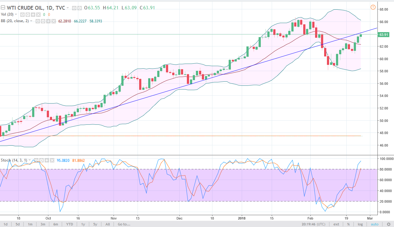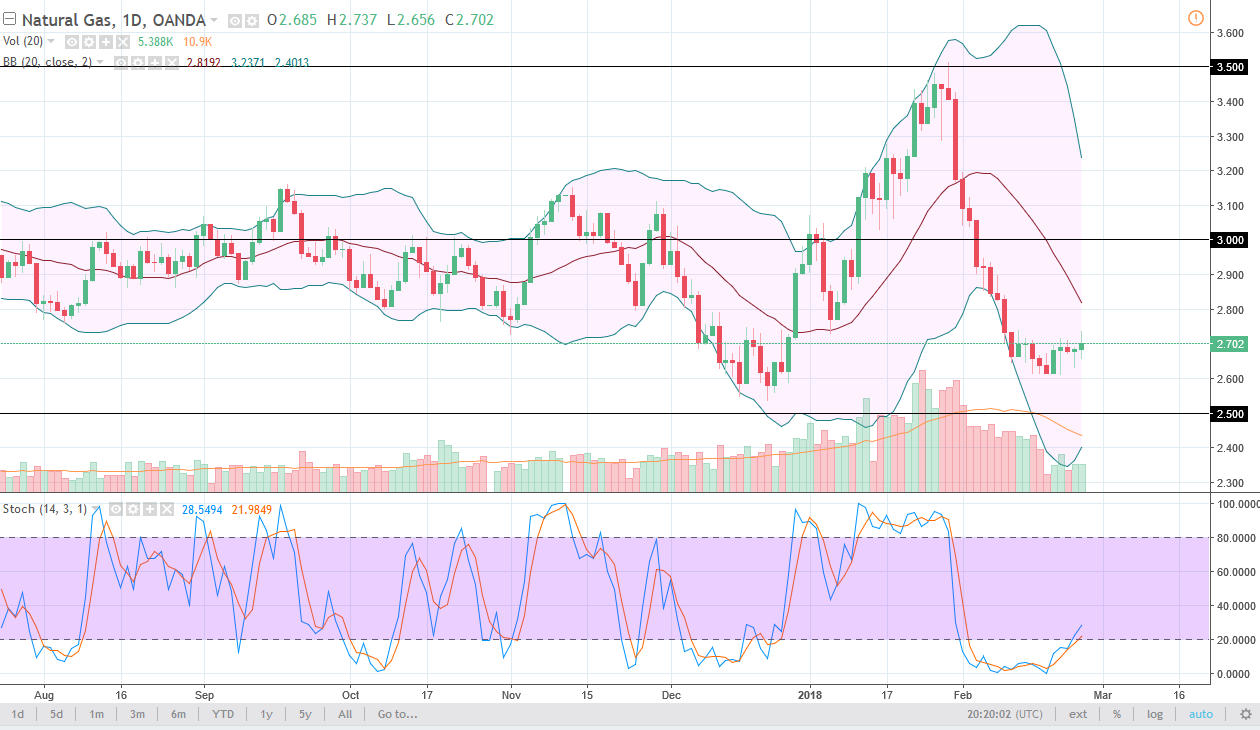 Natural gas markets went back and forth during Monday’s trading, hanging about the $2.70 level. It’s a reasonably bullish looking candle, and quite frankly I think this market is overdue for some type of correction after the massive selloff. Volume is a bit light, but I think you wouldn’t take much to get some short selling profit-taking going in this market. I believe that the $2.50 level underneath is massively supportive, so I think it’s going to take something special to break down below that level. I anticipate that we will rally towards the $3.00 level above, where I would anticipate seeing even more resistance. Ultimately, I am a seller of signs of exhaustion after rallies, as we are leaving the cold part of the year in the United States, and therefore demand will fall. Beyond that, Americans are at it again, fracking at record levels. I believe that unless you are a short-term trader, this is a “only” type of situation.