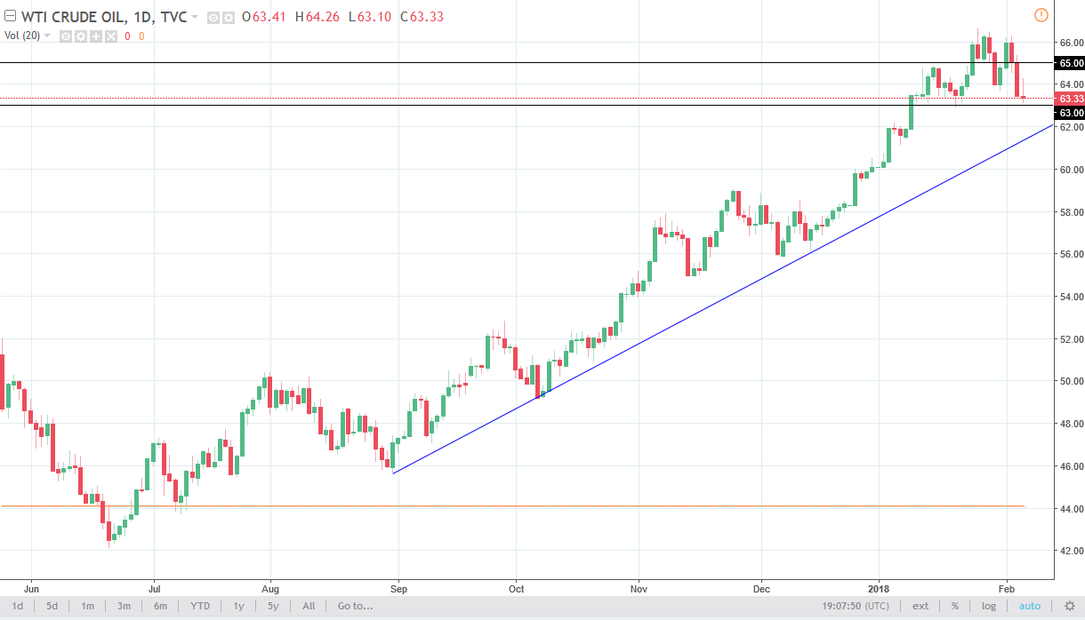 The WTI Crude Oil market initially tried to rally during the trading session on Tuesday, but have rolled over since then, forming a shooting star that sits on top of support. I think that the $63 level should be supportive, but if we break down below there, I think that the market will probably drop down to the $62 level next. Below there, I see an uptrend line that is crucial for the buyers to stay above to continue the uptrend. If we break down below the uptrend, then I think the market is probably going to start falling, perhaps as low as $56. Pay attention to the US dollar, it has is influence as well, but at this point I think that the market is still somewhat bullish, but may need to pull back to find value, just as the stock markets have done.