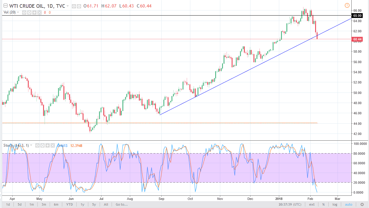The WTI Crude Oil market fell over during the trading session on Thursday, slicing through an uptrend line that has been keeping this market higher for months. Now that we have sliced through this line, it’s likely that we will continue to go towards the $60 handle, and then eventually below there. Supply continues to build in the United States, so having said that it’s likely that the oil markets will continue to go lower. A strengthening US dollar will exacerbate this if that continues as well. $60 will offer a bit of support, but I think we break down below there and go towards the $56 level over the next several sessions. If we break above the $62 level, then I think the uptrend could continue, but right now it certainly looks as if the sellers are starting to take control again.