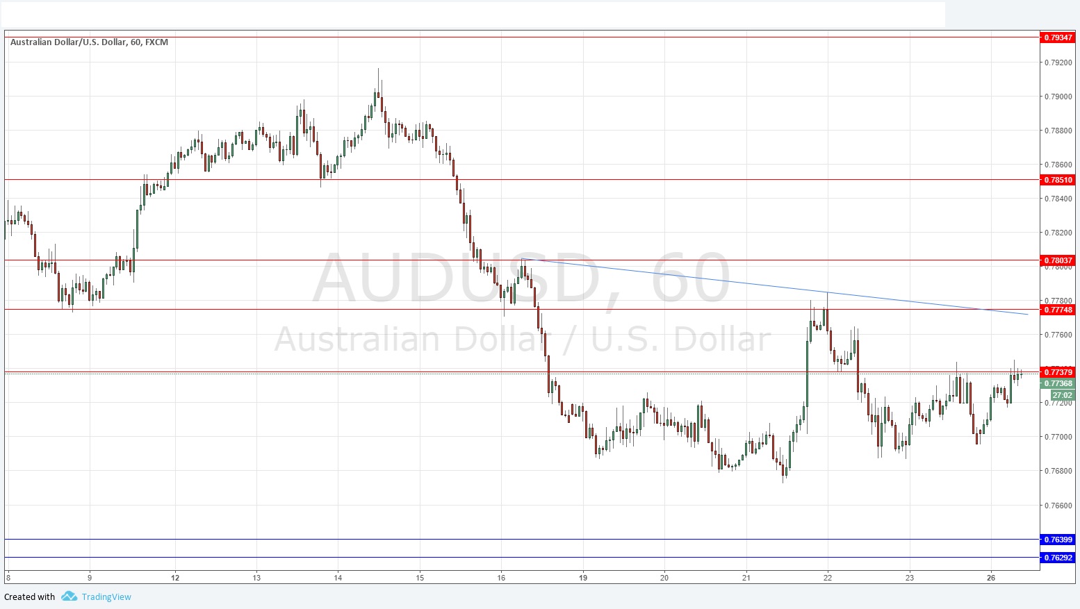 Last Thursday I took a bullish bias above the level at 0.7725. The price has since oscillated around that level without truly going anywhere. Now there is a new, lower resistance level which has formed at 0.7738. It has acted as both support and resistance and is currently acting as resistance again. As it has held twice, a break above the level should see bullish follow-through, but the resistant area at 0.7775 should hold (note the confluence with the bearish trend line in the price chart below). Alternatively, if the level continues to hold, the price should move down to at least the round number at 0.7700 again.