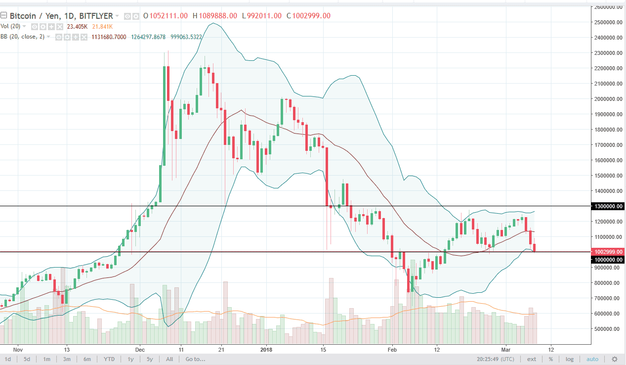 The Bitcoin market initially tried to rally against the Japanese yen as well but struggled at the ¥1.1 million level during the day to roll over and fall towards the ¥1 million level. At this point, I think that it’s likely that we continue to go lower, perhaps down to the ¥800,000 level. Beyond that, we probably go looking towards ¥700,000. At this point, it looks very likely that crypto currency markets are going to continue to struggle, as the bubble has most certainly popped. Ultimately, I think if we can break above the ¥1.1 million level, that would be a bullish sign, perhaps reaching towards the ¥1.3 million level which is a massive ceiling. However, right now I have serious doubts that this market will pick up the momentum.