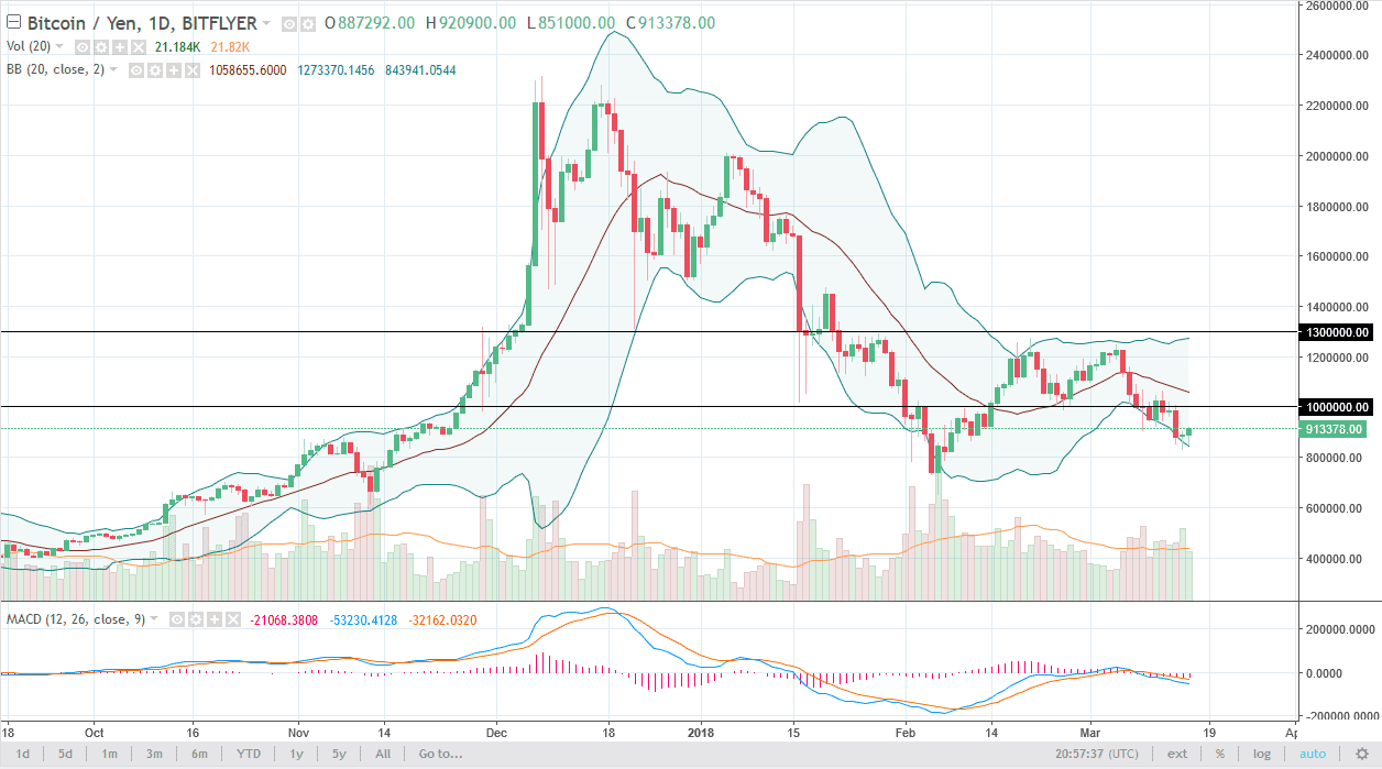 Bitcoin markets initially fell against the Japanese yen as well, but just as it did against the US dollar, we found buyers and it shot higher. We closed above the ¥900,000 level, and it looks as if we are ready to go to the ¥1 million level. If we can break above the ¥1.1 million level, that would be a very strong sign, perhaps reaching towards the ¥1.3 million level. Ultimately, I think that the market will try to find some type of stability here, but if we were to turn around a breakdown below the ¥800,000 level, that would be catastrophic. I think we are going to continue to be very choppy, and I believe that it is difficult to hang onto a trade for a significant length of time, but I believe that we will eventually find some type of clarity. What happens this weekend could be very crucial, so if we are bullish over the weekend, we probably will see some follow-through on Monday.