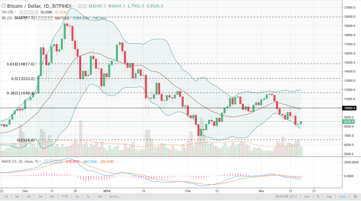 The Bitcoin market initially fell during training on Friday, finding the $8000 level to be supportive enough to turn things around and rallied. In fact, it now looks like the last 2 days have suggested that we are ready to rally. I think if we can break above the top of the range for the trading session on Friday, the market will probably go looking towards the $9000 level, then perhaps even a size $10,000. However, I believe that it is only a matter of time before the sellers return, but I will say that if we do bounce from here, it could be the beginning of some type of bottoming pattern. A break above the $10,000 level would be very strong, and send this market looking towards the $12,000 level next.
