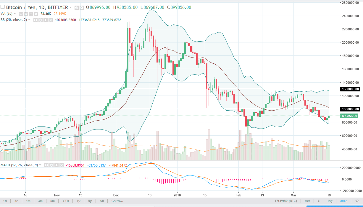 Bitcoin tried to rally against the Japanese yen during the day and did keep some of the gains over here. However, the most important thing on this chart to pay attention to in my estimation as the ¥1.1 million level. If the ¥1.1 million level gets broken to the upside, then I think we go looking towards the ¥1.3 million level beyond that. Alternately, if we break down below the ¥800,000 level, I think we will test the lows from February again, and then break down significantly to reach towards ¥600,000 and below. At this point, if we break above the ¥1.3 million level, then it will change the trend to the upside, but I don’t think it’s going to happen anytime soon, and I suspect that we will continue to see Bitcoin weakness in both pairs.