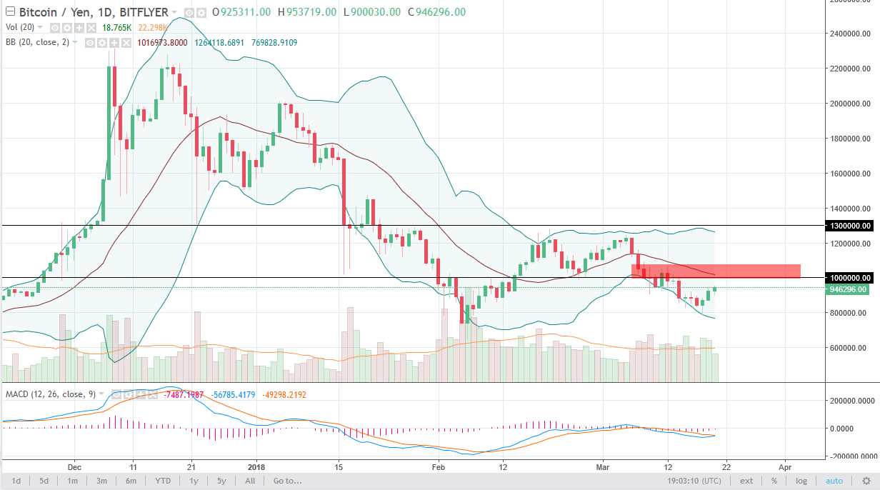 Bitcoin initially fell against the Japanese yen during the trading on Tuesday but turned around to form a bit of a hammer. The hammer suggesting that we are ready to rally from here as well, but I think there is massive amounts of support at the ¥1 million level, extending to the ¥1.1 million level. I believe that the market will continue to see significant twists and turns, but if we were to break above that ¥1.1 million level, we could go as high as ¥1.3 million. Otherwise, I believe that we will continue consolidating between ¥800,000 on the bottom, and the ¥1 million on the top. I believe that Bitcoin will continue to struggle, because there is going to be a significant lack of confidence after the breakdown.