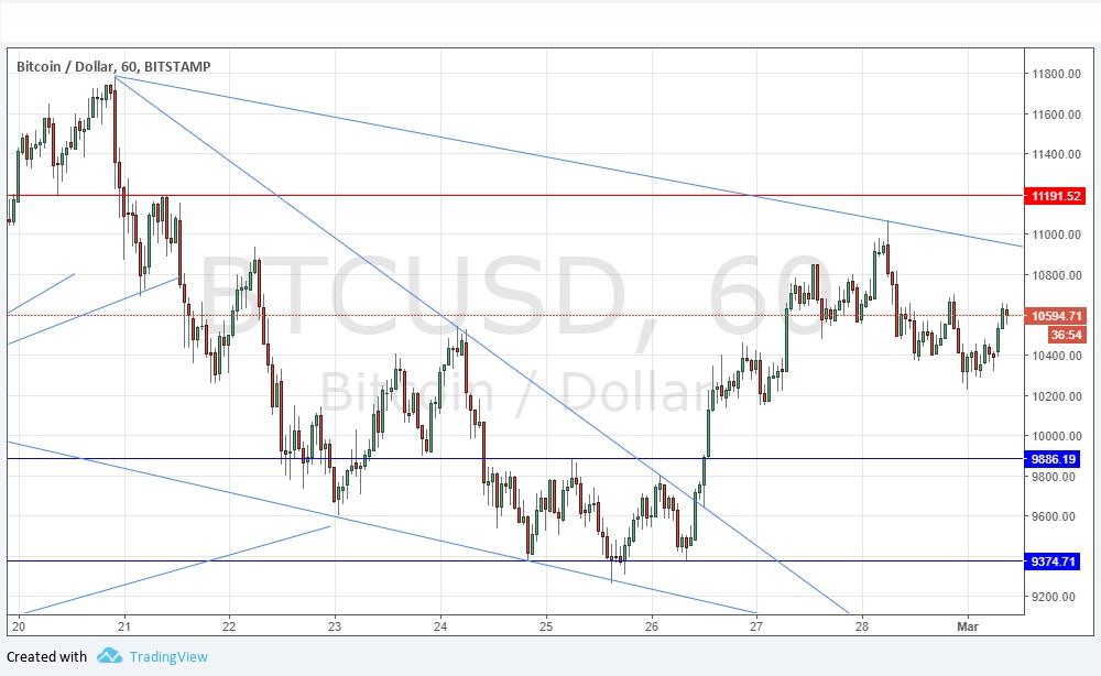 Yesterday I wrote that I would remain bullish, provided the price remains above $10,481, but I noted there is now a descending trend line which can connect the two swing highs which matches a lower trend line to form a symmetrical bearish channel. The price did not remain above $10,481 so I have no directional bias now. That support level has been invalidated so it seems as if the price is most probably going to consolidate between minor support at about $10,200 and an area of resistance beginning at about $11,000. I have no directional bias and I thin both bulls and bears are quite strong and will just fight it out within this area.