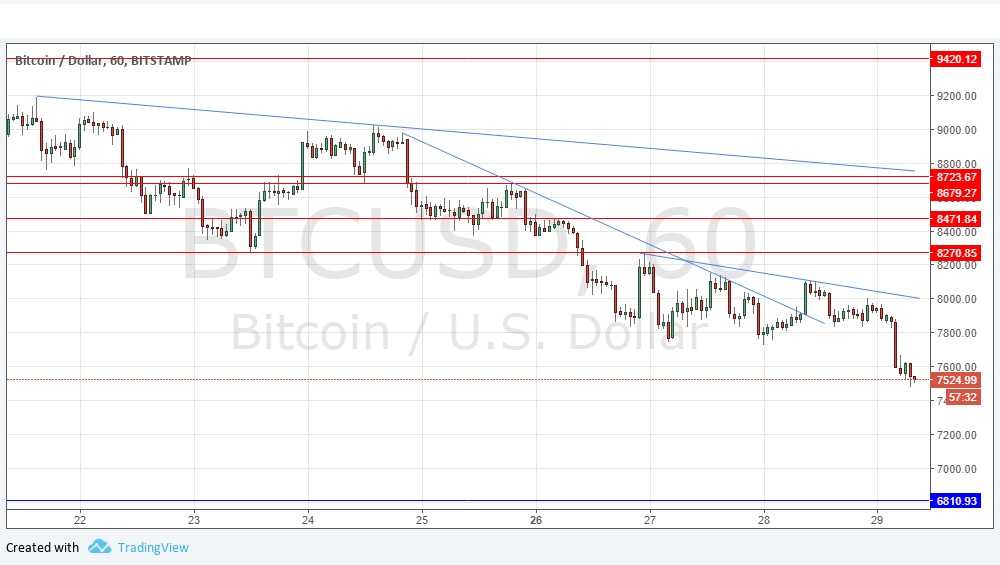 I maintained a bearish bias yesterday and was proved to be correct, as the price has continued to fall. The bearish trend line shown in the price chart yesterday was broken to the upside, but a new bearish trend line can be drawn which suppresses the price. The price also sold off yesterday at the round number of $8,000 which is another bearish sign, and there remains a clear long-term bearish trend in all major cryptocurrencies. For these reasons I am very comfortable having a bearish bias on Bitcoin going forward. Recent hours have seen the price reach $7,500 and it is possible this psychological level may produce some support. However, I look a little lower for a potential bullish bounce, at the old support level of $6,811.